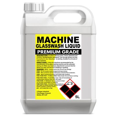 A machine glasswash detergent that removes stains and soiling, leaving glassware sparkling. Product is pre-softened for effectiveness in both hard and soft water. Use to clean glassware, glasses and tumblers in all automatic glass washing machines.Suitable for use in pubs, clubs, nightclubs, restaurants and bars. Always Follow the directions recommended by the manufacturers of the automatic glass washing machine and the automatic dosing unit. Make any necessary adjustments to ensure that the dishes are clean and free from streaking or spotting.